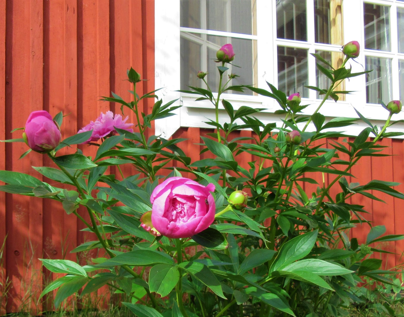 Kesän vihreyttä vasten hallavan punainen liiterin lautaseinä saa uutta väriä kontrastina.